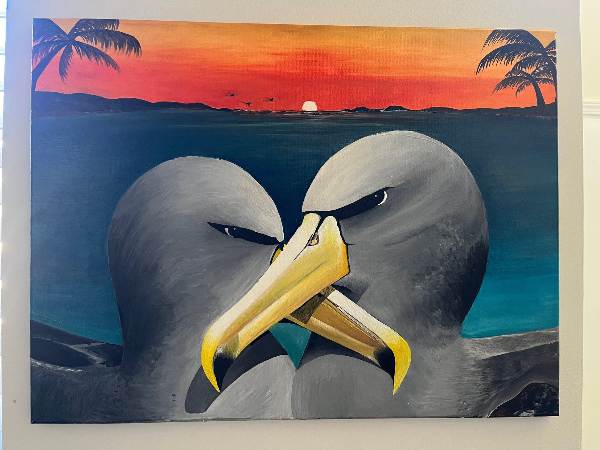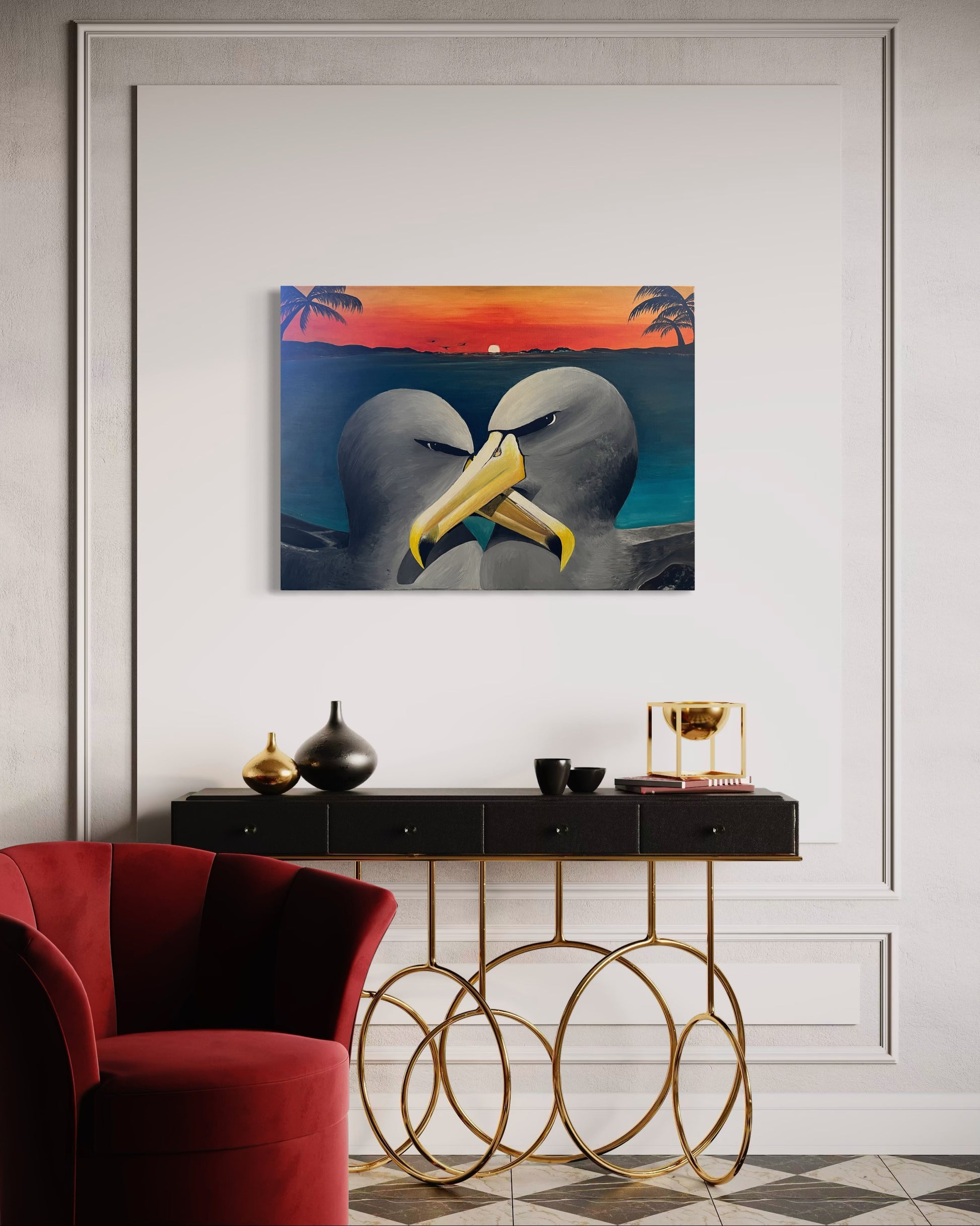 “Two albatrosses interlock in tender unity, framed by a vibrant tropical sunset, emphasizing natural harmony.”