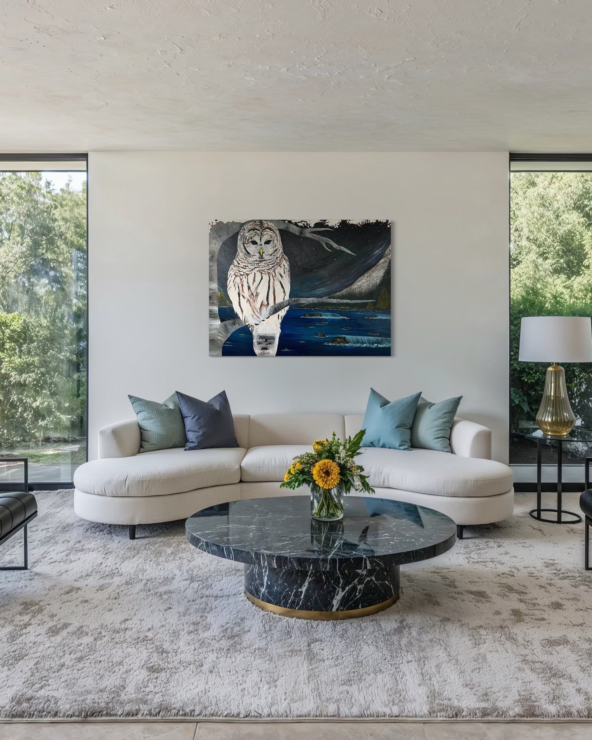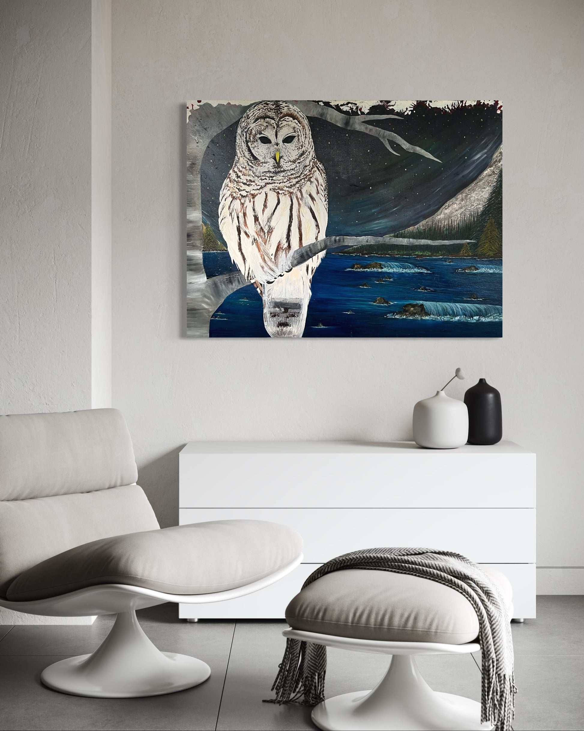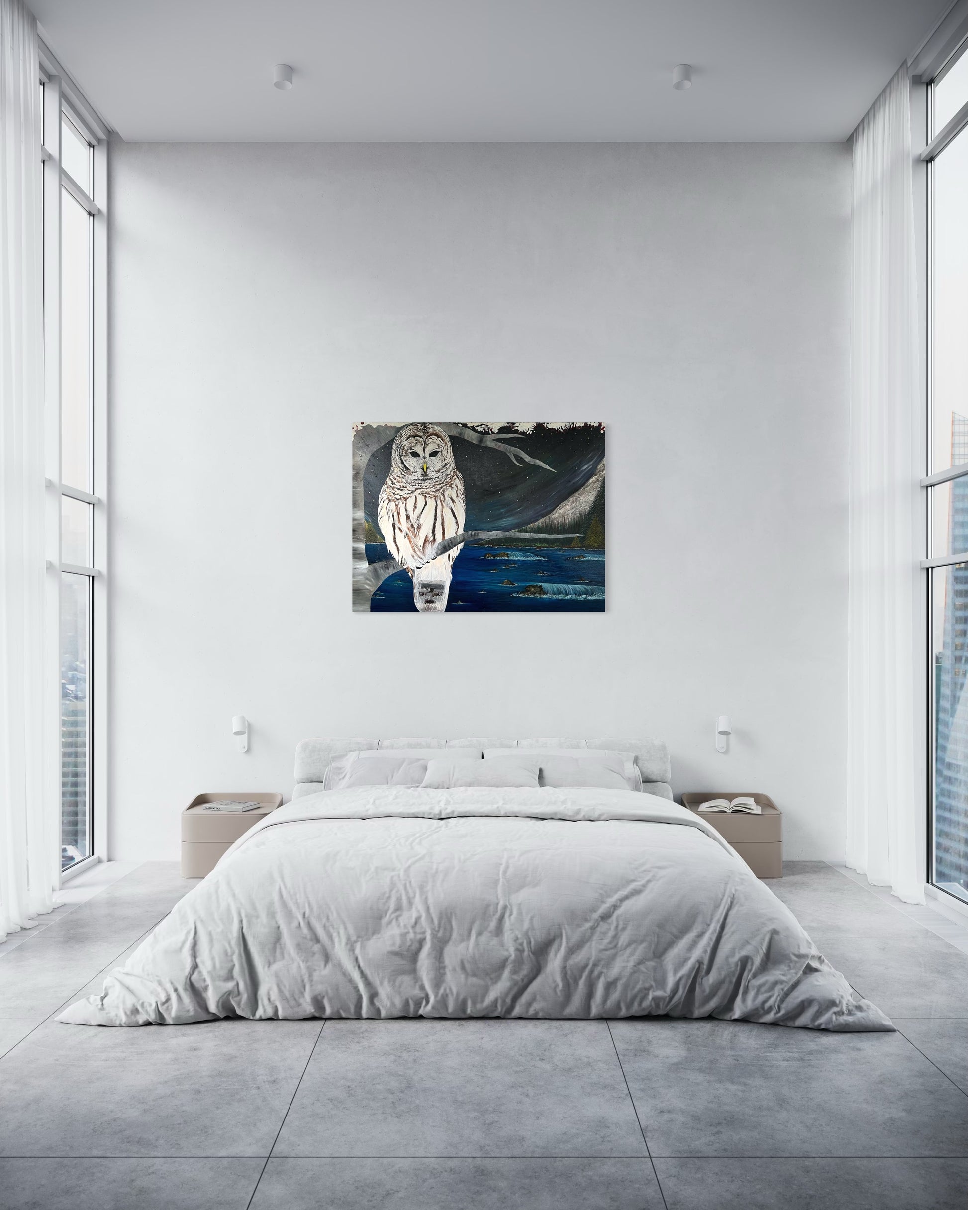 “A mystical scene where the owl becomes one with the night, blending nature and mystery.“